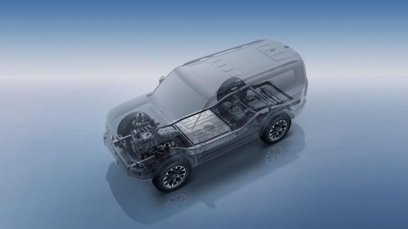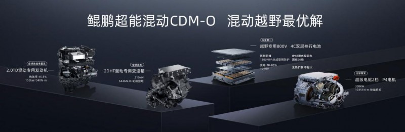 在配套系统方面,鲲鹏超能混动CDM-O系统同样展现“全球首创”实力。搭载全球首款纵置2挡DHT混动专用变速箱,传动效率高达98%,可实现“低速大扭矩、高速低油耗”的无缝切换;全球首发的2挡P4电机最大功率 300kW,1 挡速比达 23.8,后轮端峰值扭矩达10351N?m,为越野脱困提供强劲动力支撑;配合800V宁德时代混动专用电池,配备1300MPA热成型钢板防护,兼顾安全性与续航能力。
