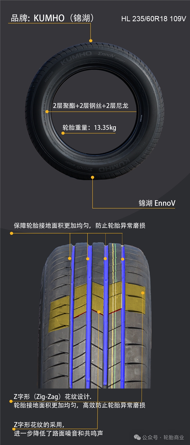 2025年11月,轮胎商业选择了2024款小鹏P7+来实测这款轮胎的真实驾驶体验。今天测评的轮胎是锦湖EnnoV SPORT轮胎,测试规格为HL 235/60R18 109V 下面就来详细了解一下这款轮胎。